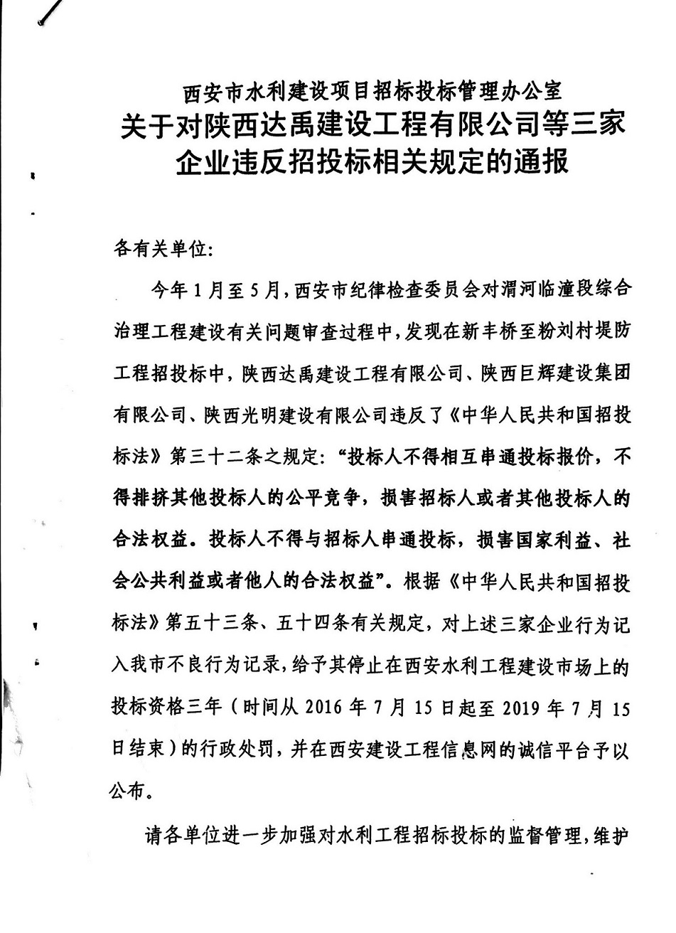 西安市水利建设项目招标投标管理办公室关于对陕西达禹建设工程有限公司等三家企业违反招投标相关规定的通报