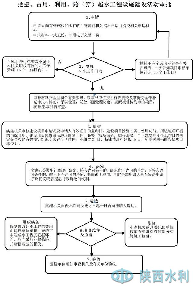 办理依据 《陕西省水工程管理条例》第十五条 兴建铁路、公路、厂矿、铺设管道等,须挖掘、占用、利用、跨(穿)越水工程设施的,建设单位应当征求水工程管理单位或水工程所有者的意见,经有关部门批准,并与其签订协议后方可施工。修复或改建水工程的费用由建设单位承担。在施工中造成水工程其它损坏的,应当采取补救措施,并赔偿相应的损失。、第十七条:水工程、防汛专用道路及坝顶、堤防、渠堤兼作公路用于社会运输的,须经省水行政主管部门批准。需收费的,按有关规定报省人民政府批准。
