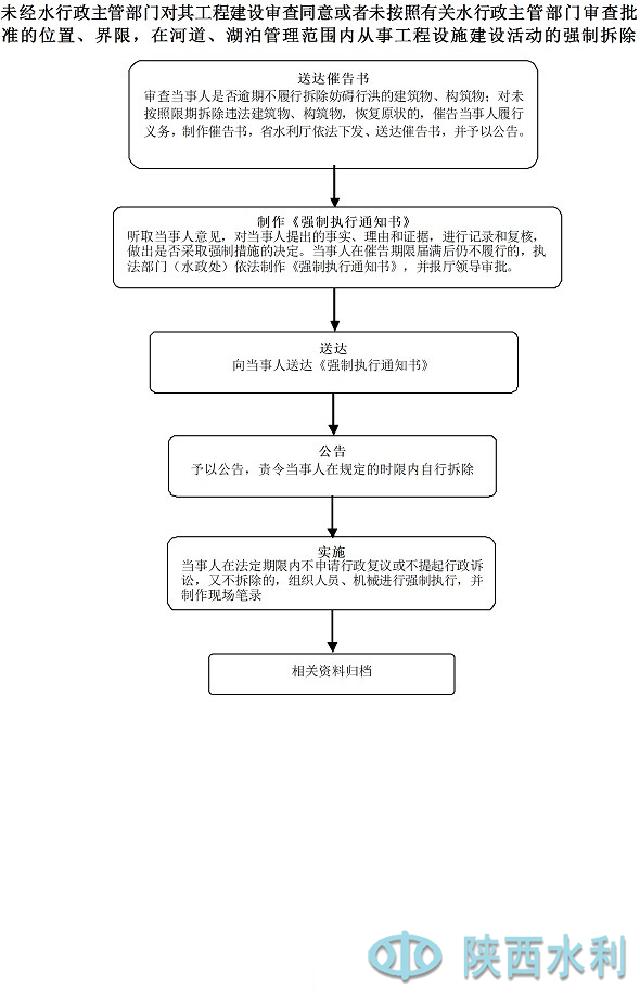 事项名称 未经水行政主管部门对其工程建设审查同意或者未按照有关水行政主管部门审查批准的位置、界限,在河道、湖泊管理范围内从事工程设施建设活动的强制拆除