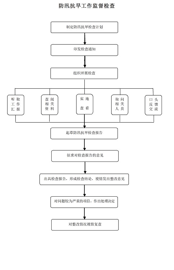 办理依据 《中华人民共和国防洪法》第八条 县级以上地方人民政府水行政主管部门在本级人民政府的领导下,负责本行政区域内防洪的组织、协调、监督、指导等日常工作。县级以上地方人民政府建设行政主管部门和其他有关部门在本级人民政府的领导下,按照各自的职责,负责有关的防洪工作。 《中华人民共和国防汛条例》(国务院1991年第86号令)第十五条 各级防汛指挥部应当在汛前对各类防洪设施组织检查,发现影响防洪安全的问题,责成责任单位在规定的期限内处理,不得贻误防汛抗洪工作。各有关部门和单位按照防汛指挥部的统一部署,对所管辖的防洪工程设施进行汛前检查后,必须将影响防洪安全的问题和处理措施报有管辖权的防汛指挥部和上级主管部门,并按照该防汛指挥部的要求予以处理。 《中华人民共和国抗旱条例》(国务院2009年第552号令)第八条 县级以上地方人民政府防汛抗旱指挥机构,在上级防汛抗旱指挥机构和本级人民政府的领导下,负责组织、指挥本行政区域内的抗旱工作。 县级以上地方人民政府水行政主管部门负责本行政区域内抗旱的指导、监督、管理工作,承担本级人民政府防汛抗旱指挥机构的具体工作。县级以上地方人民政府防汛抗旱指挥机构的其他成员单位按照各自职责,负责有关抗旱工作。 《陕西省实施抗旱条例细则》(陕西省人民政府2015年第183号令)第四条 县级以上人民政府水行政主管部门负责本行政区域内抗旱的指导、监督、管理工作,承担本级人民政府防汛抗旱指挥机构的具体工作。