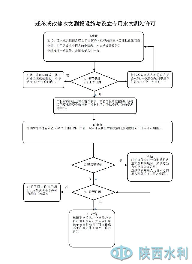 办理依据 《中华人民共和国水文条例》(国务院2007年第496号令)第十五条 设立专用水文测站,不得与国家基本水文测站重复;在国家基本水文测站覆盖的区域,确需设立专用水文测站的,应当按照管理权限报 流域管理机构或者省、自治区、直辖市人民政府水行政主管部门直属水文机构批准。其中,因交通、航运、环境保护等需要设立专用水文测站的,有关主管部门批准前,应当征求流域管理机构或者省、自治区、直辖市人民政府水行政主管部门直属水文机构的意见。 《陕西省实施〈中华人民共和国防洪法〉办法》第十八条第三款 因工程建设需要迁移或者改建水文测报设施的,应当征得水文主管部门的同意,迁移或者改建的费用由工程建设单位承担。 《陕西省水文管理条例》第十三条 企业事业单位因生产、经营活动需要设立专用水文测站的,由省水行政主管部门审批。