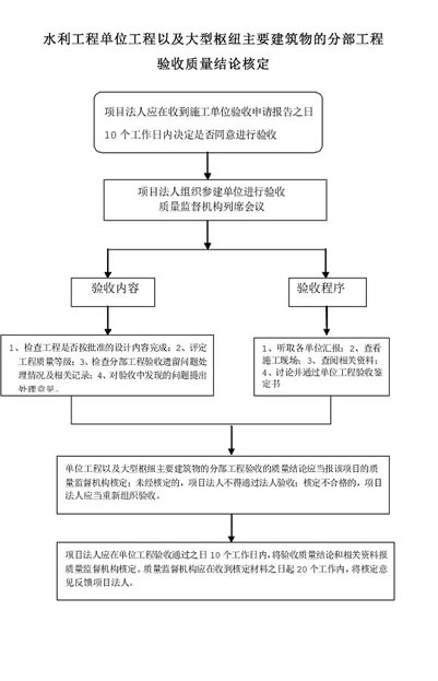 办理依据 《水利工程建设项目验收管理规定》(水利部2007年第30号令)第十六条第二款 单位工程以及大型枢纽主要建筑物的分部工程验收的质量结论应当报该项目的质量监督机构核定;未经核定的,项目法人不得通过法人验收;核定不合格的,项目法人应当重新组织验收。质量监督机构应当自收到核定材料之日起20个工作日内完成核定。
