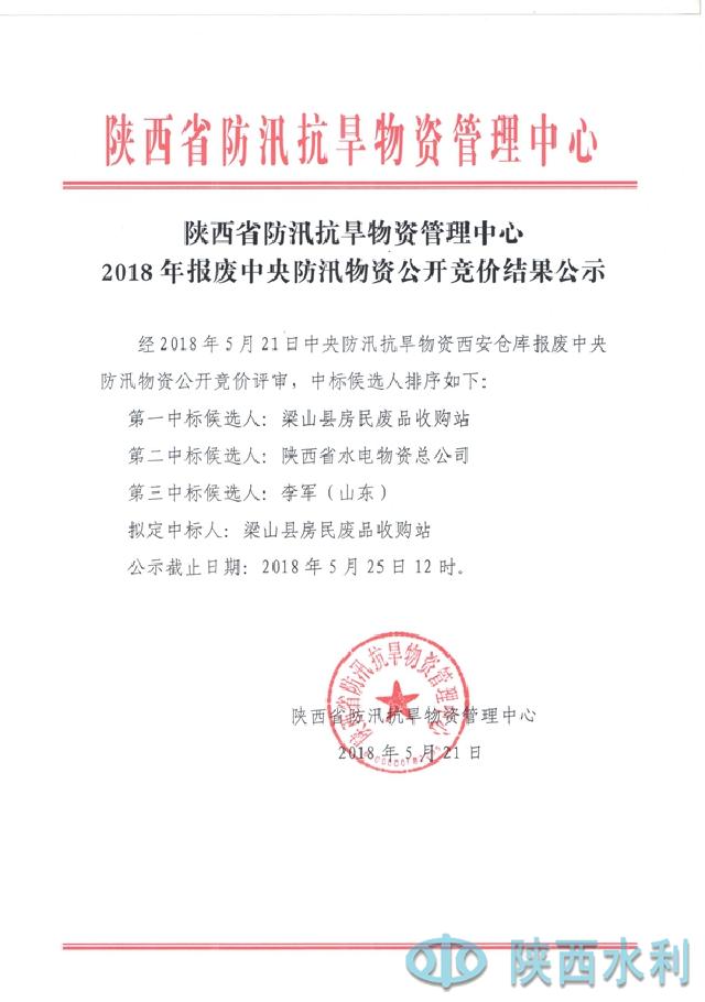 陕西省防汛抗旱物资管理中心2018年报废中央防汛物资公开竞价结果公示